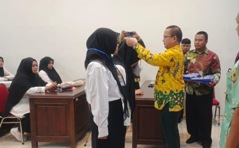 Foto : Sekretaris Disnaker Sumenep, dr. Kusmuni, menyematkan tanda peserta secara simbolis kepada salah satu peserta pelatihan Tata Boga berbasis kompetensi, kamis (3/7/2025).