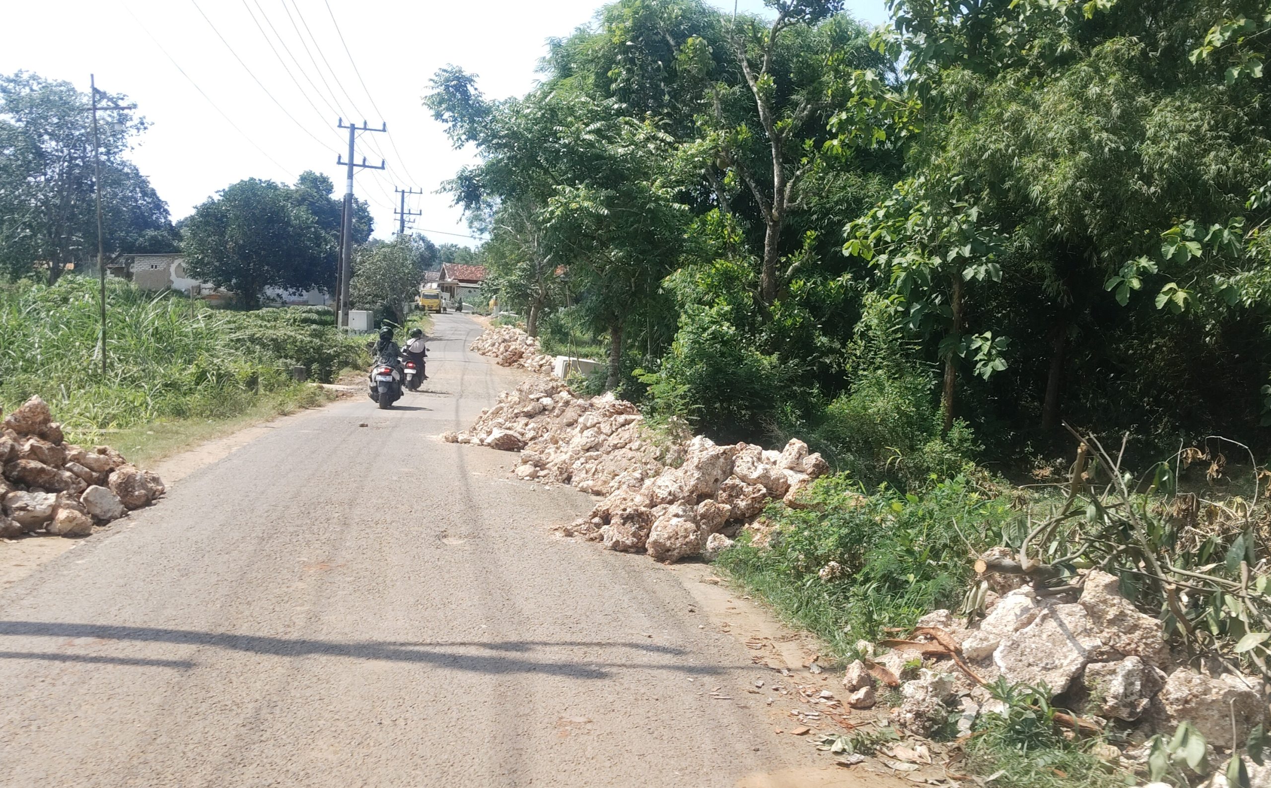Foto : Pengendara motor melewati di Ruas Jalan Matanair–Pakondeng, Sumenep Material Proyek Jalan Menumpuk.